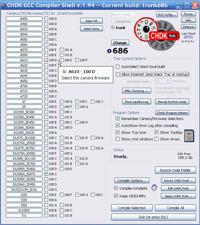 To compile your own CHDK just select camera (and firmware), select apropriate compile options and press Compile Selected button. After a while your binaries will appear in the directory: your_source/bin. You can easly click the Source Code Folder to open this place and then navigate to ./bin.