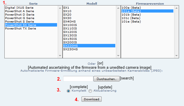 Select a camera series, model and firmware (1.) or upload an unedited camera image for automatic detection of the firmware (2.). In case of the automatic detection the download starts in some seconds automatically.