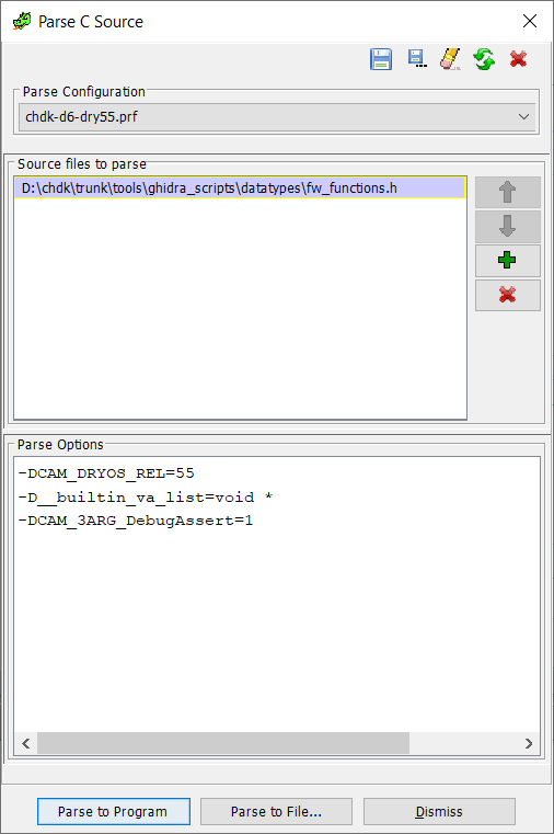 To import header files, you must create a "parse configuration" which sets the header files to be used, along with any defines that need to be set when the header files are used. For the CHDK files, different defines are required depending on the camera, as described below.