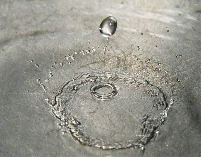 This clearly shows the highlight from the fluorescent lamp above the sink. The other images also catching the greenish fluorescent ting. Giving these photos that available-light quality. I like the way that the back out-of-focus splash-ring from the previous drop is being refocused into clarity by the suspended drop that's next to hit. Very zen and fractal-like. The basis of optics and photography being performed by the inanimate(?) subjects themselves. :-)