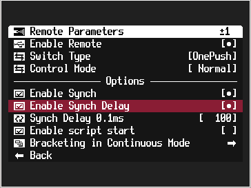 To more precisely tune the synchronization between cameras, CHDK allows a precise fixed delay to be added to each camera to adjust for differences in the time each camera takes to finish shooting a picture. The sync delay value is given in units of 0.1 mSec.
