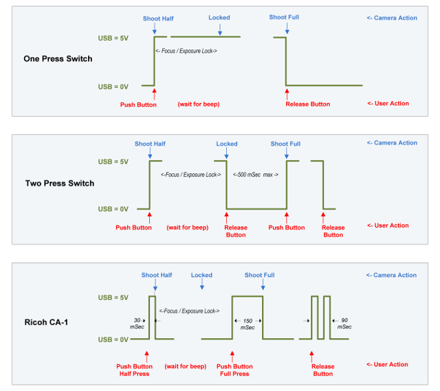 Used with a Ricoh CA-1 switch device. Half pressing the button causes the CA-1 to create a 30 mSec pulse that initiates a "half press" state. Releasing the switch at that point will generate 2x30 mSec pulses that cancel the shooting sequences. Full pressing the button will create a 150 mSec pulse that will initiate a "full press" state for 100 mSec.